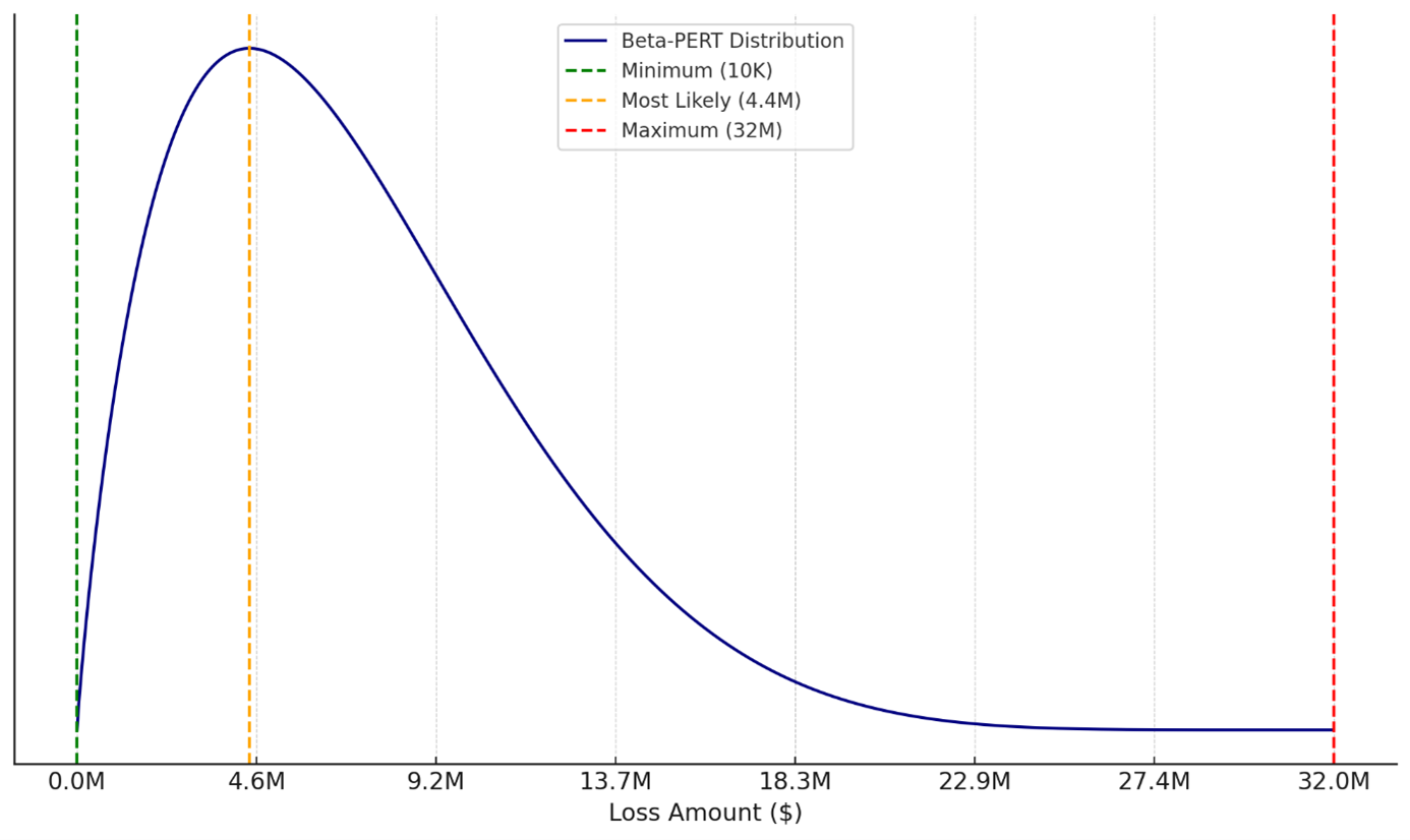 After studying the Figure 2: IRIS 2025 - distribution of reported losses for security incidents from 2015 to 2024 above, we choose $10K as the Minimum Value and $32M as the Maximum Value, rather than using extreme values like $1K and $100M.