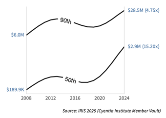 The maximum ($32M) is empirically based on the IRIS 2025 data: