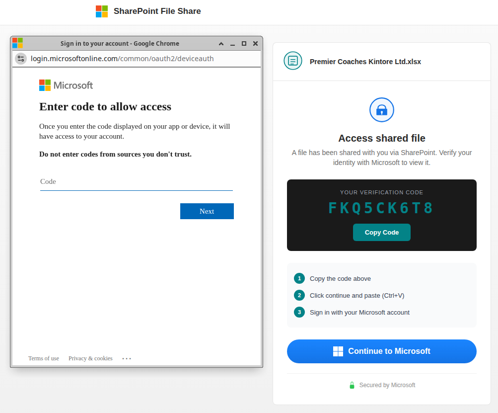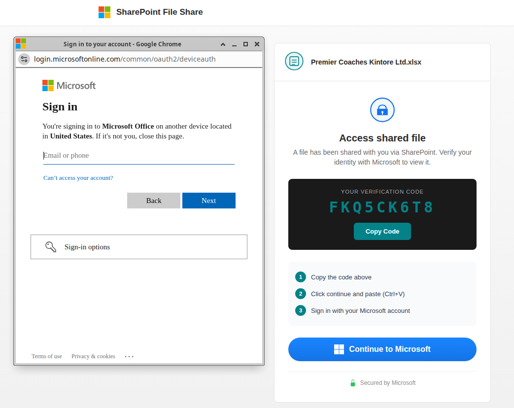 In practice, the trap may impersonate a service such as SharePoint or DocuSign and present the victim with a verification code alongside a prompt to continue to Microsoft. The victim is then taken to a legitimate Microsoft device authentication page, where they are instructed to copy the displayed code, continue, paste it, and sign in.